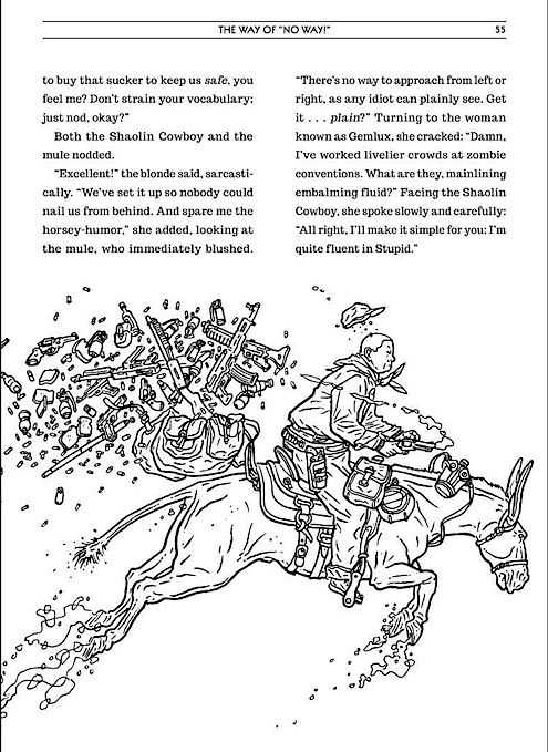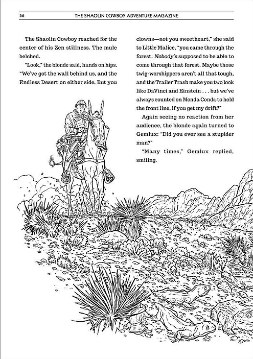 The Shaolin Cowboy Adventure Magazine – das ist knallharte Kung-Fu Prosa und illustrierte Verstümmelungen. Eine Erzählung voller unglaublicher Abenteuer und unbarmherzigem Blutvergießen. Der Shaolin Cowboy und sein treues Maultier kämpfen gegen miese Typen, erdrückend miese Siegchancen und mieses Wetter in der heftigsten Auseinandersetzung aller heftigen Auseinandersetzungen.
